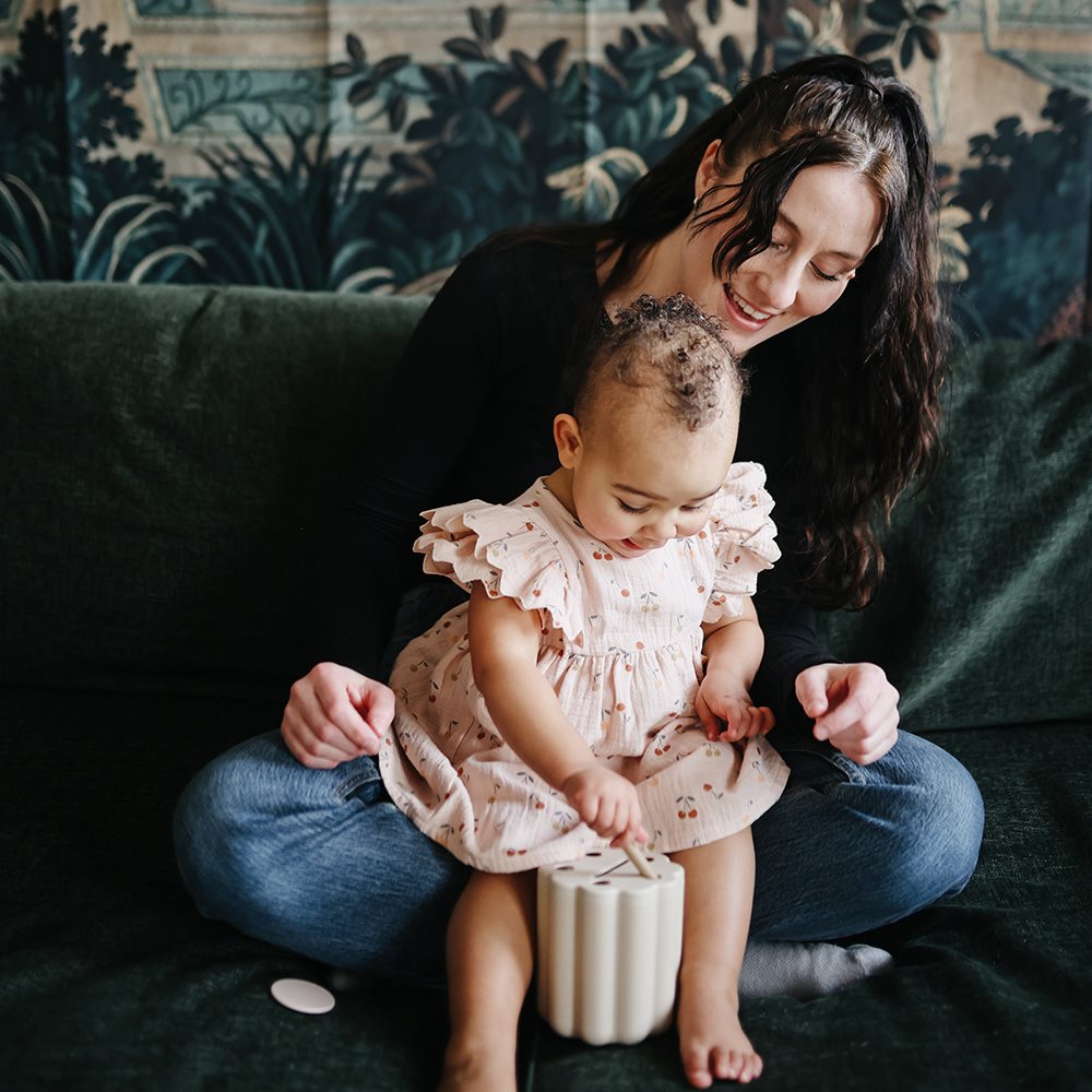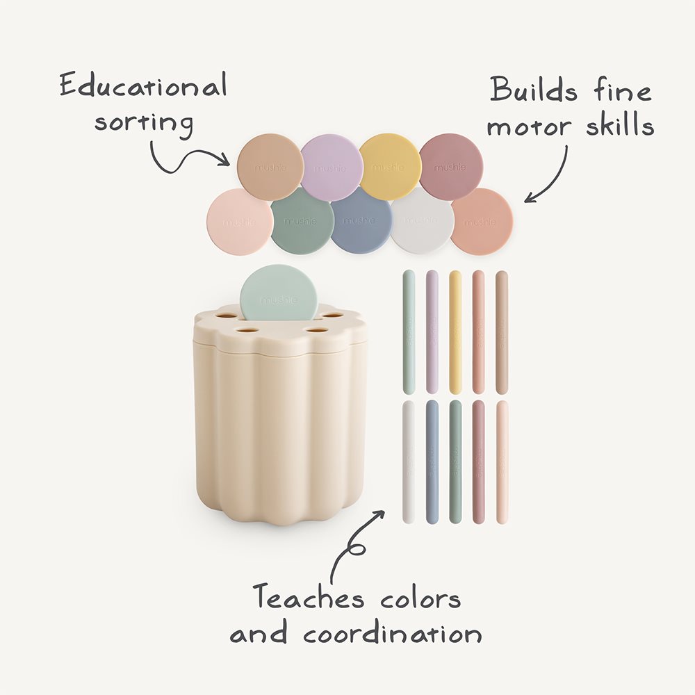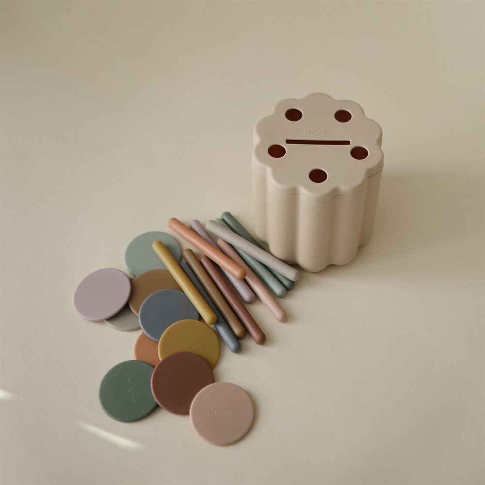 Let children explore sorting and matching with Mushie’s Coin & Tube Sorting Box Set!