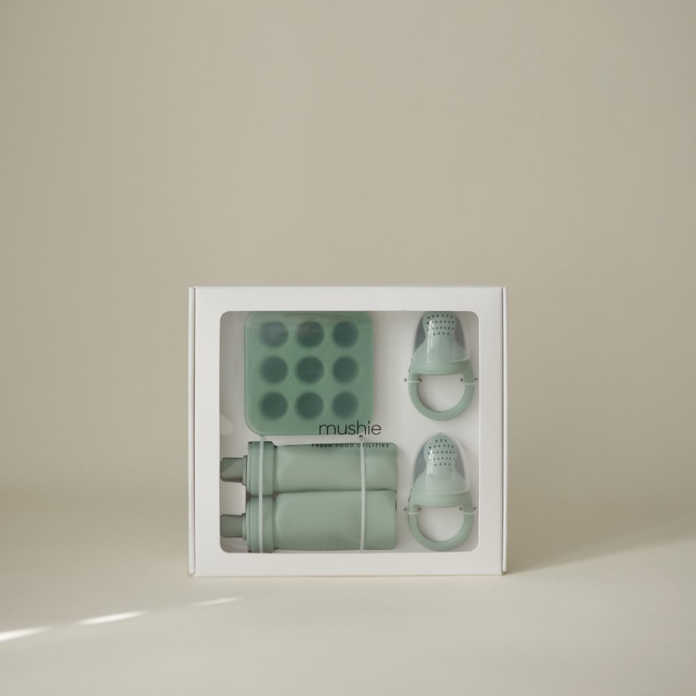 The fresh food feeder introduces new flavors and textures safely with its food-grade silicone design, easy-to-hold handle, and two-piece construction for quick cleaning. The silicone freezer tray features nine perfectly portioned compartments and a frosted lid, making it simple to freeze and store purees that fit the feeder. Completing the set, the reusable silicone puree pouches offer a convenient, mess-free way to serve smoothies, yogurt or purees at home or on the go.