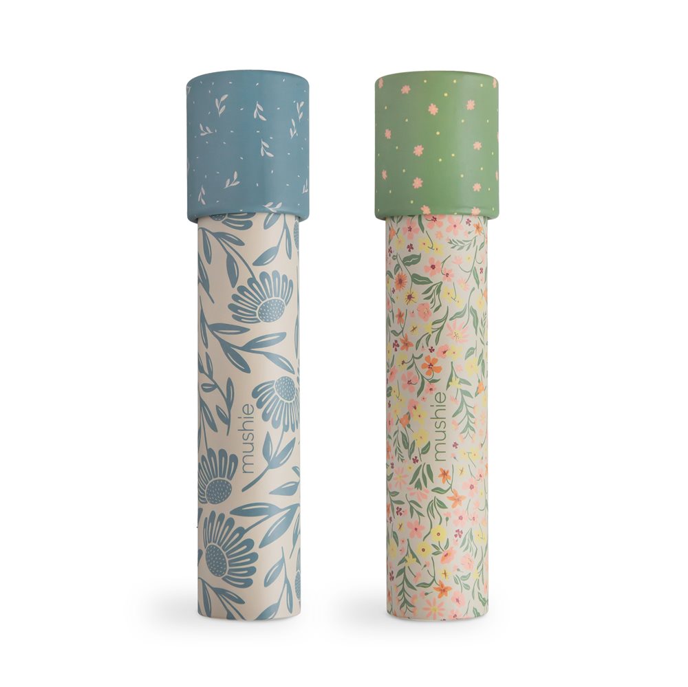 Discover simple joys with this set of Mushie kaleidoscopes, designed to spark curiosity and imagination through ever changing patterns of light and color. The set includes a playful theme of flowers, Pastel Blooms and Blue Flowers, inviting little ones to explore visual details and enjoy quiet moments of discovery both at home and on the go.