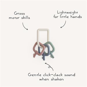 The lightweight key ring is designed for small hands to easily hold and shake, producing a gentle click-clack sound. Crafted from ABS plastic, easy to clean and safe for teething gums.