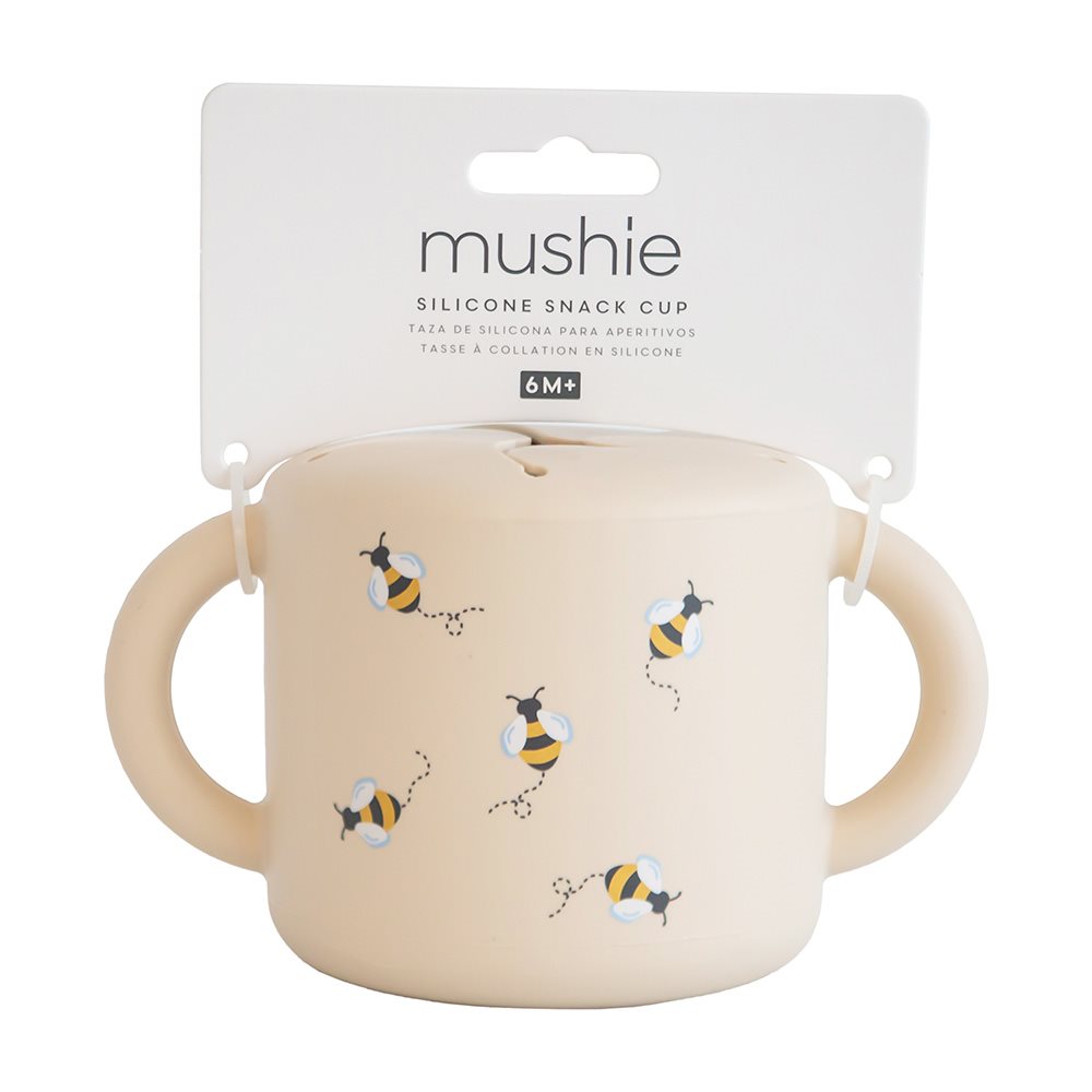 Mushie's snack cup in a soft color, featuring a beautiful bee-inspired design!